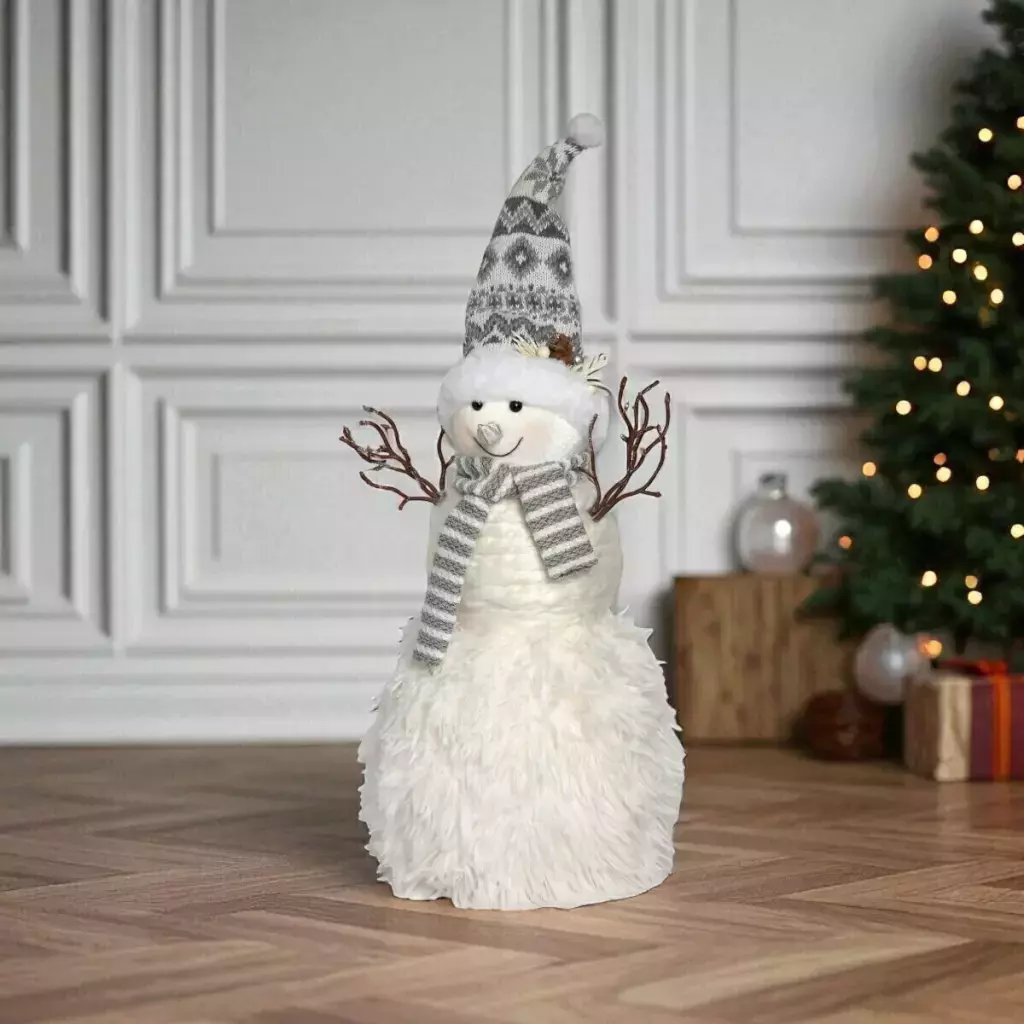 Este muñeco de nieve destaca por su cuerpo de textura suave en un blanco puro que invita a tocarlo y a sentir la ternura propia de la temporada. Sus brazos, elaborados con ramas artificiales, aportan un toque natural que realza su autenticidad, mientras que la bufanda gris a rayas introduce un estilo moderno y acogedor.